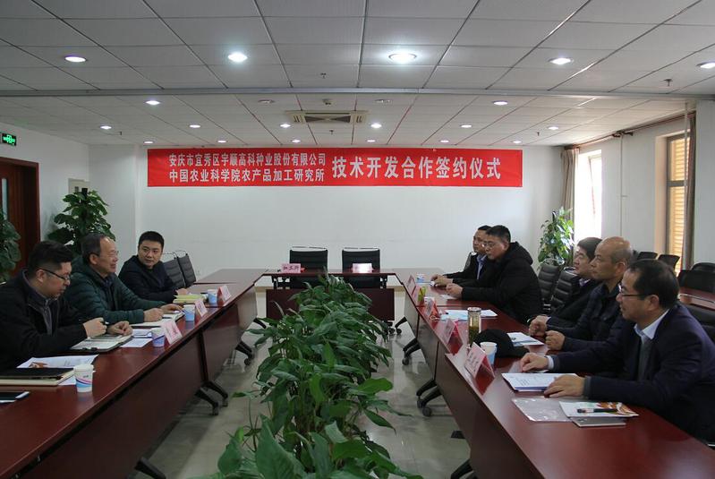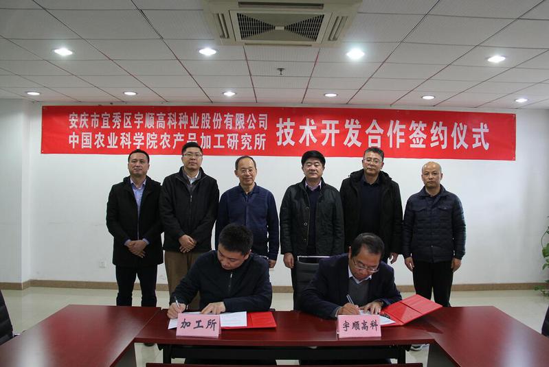 11月27日下午,中國農(nóng)業(yè)科學院農(nóng)產(chǎn)品加工所與宇順高科種業(yè)股份有限公司簽約儀式在北京舉行。中國農(nóng)業(yè)科學院農(nóng)產(chǎn)品加工研究所黨委書記王長江、安慶市宜秀區(qū)區(qū)委書記婁雪松、成果轉化處副處長常盛、新資源食品研究中心研究員佟立濤、區(qū)農(nóng)業(yè)農(nóng)村局局長潘緒中、區(qū)文化和旅游局局長何反修、區(qū)林業(yè)局副局長李凱以及公司創(chuàng)始人王發(fā)文等出席。