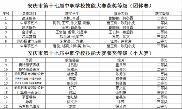 近日,安慶市第十七屆中職學(xué)校技能大賽成績(jī)揭曉,安慶皖江中等專業(yè)學(xué)校再獲佳績(jī),共有12 項(xiàng) 30人次獲獎(jiǎng),其中一等獎(jiǎng)1個(gè)1人次,二等獎(jiǎng)7個(gè)11人次,三等獎(jiǎng)10個(gè)18人次,獲獎(jiǎng)率達(dá)78.95%。
