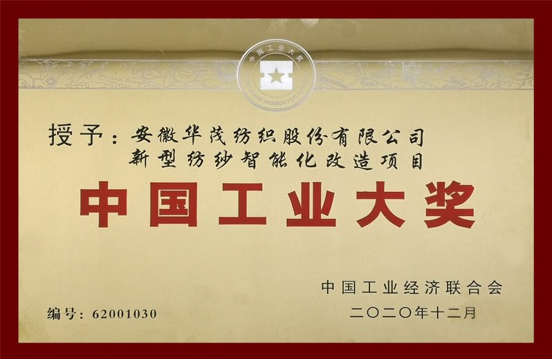 12月27日上午,從北京召開(kāi)的第六屆中國(guó)工業(yè)大獎(jiǎng)發(fā)布會(huì)上傳來(lái)喜訊,由安徽華茂申報(bào)的新型紡紗智能化改造項(xiàng)目榮獲“中國(guó)工業(yè)大獎(jiǎng)”。中國(guó)工業(yè)大獎(jiǎng)是我國(guó)工業(yè)領(lǐng)域最高獎(jiǎng)項(xiàng),獎(jiǎng)項(xiàng)的獲得是對(duì)安徽華茂在以制造強(qiáng)國(guó)為己任、以產(chǎn)業(yè)報(bào)國(guó)為初心,堅(jiān)持自立自強(qiáng),走中國(guó)特色創(chuàng)新發(fā)展、綠色發(fā)展新型工業(yè)化道路等方面做出突出成績(jī)的充分肯定。