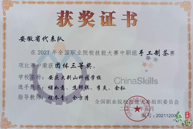 2021年,安慶大別山科技學校手工制茶項目代表隊在程冬青、余方清、王祝華3名教師精心指導下,在4月安徽省舉行的全國職業(yè)院校技能大賽中職組手工制茶項目選拔賽中以團體總分第一的優(yōu)異成績?nèi)〉脟愘Y格,最終代表安徽省出戰(zhàn)本屆手工制茶項目國賽。經(jīng)過前期日以繼夜的艱苦備賽和賽場全力拼搏,該校代表隊再次榮登國賽領(lǐng)獎臺。
