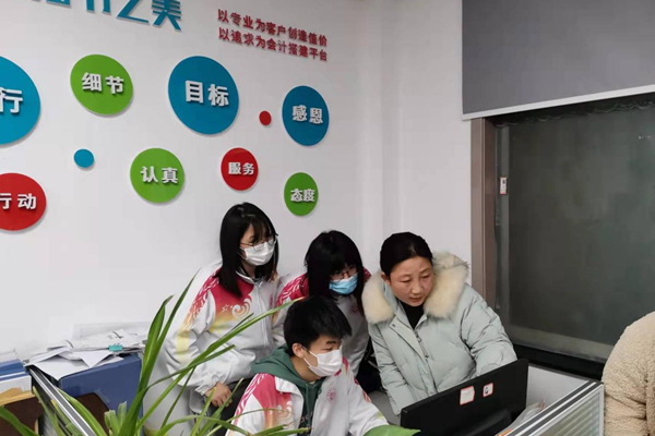 第二天,部分學(xué)生代表來到協(xié)成財務(wù)咨詢有限公司參觀、座談,三人一組在師傅帶領(lǐng)下上機操作,現(xiàn)場體驗真實的財務(wù)和稅收系統(tǒng)。
