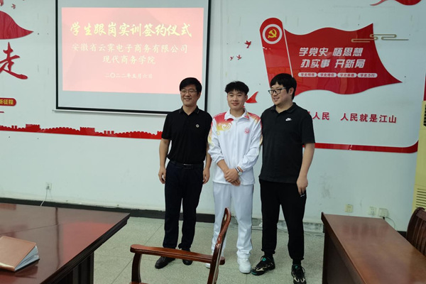 5月6日上午,安慶職業(yè)技術(shù)學院現(xiàn)代商務(wù)學院在3號教學樓510會議室,與安徽省云霽電子商務(wù)有限公司隆重舉辦20級電子商務(wù)專業(yè)學生跟崗實習簽約儀式,標志著學院在校企合作和教學改革開啟了新篇章?,F(xiàn)代商務(wù)學院黨總支班子成員、電子商務(wù)專業(yè)教師代表、輔導員及10名學生代表出席儀式,云霽電商公司總經(jīng)理程賽超一行四人出席了簽約儀式。