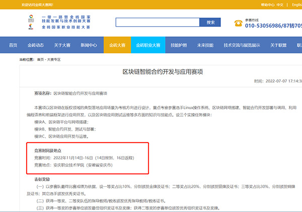 7月7日,從一帶一路暨金磚國家技能發(fā)展與技術(shù)創(chuàng)新大賽/金磚國家職業(yè)技能大賽官網(wǎng)傳來消息,安慶職業(yè)技術(shù)學(xué)院申報的“2022一帶一路暨金磚國家技能發(fā)展與技術(shù)創(chuàng)新大賽——區(qū)塊鏈智能合約開發(fā)與應(yīng)用賽項”國內(nèi)賽承辦校資格成功獲批,網(wǎng)站同步公布了《報名通知》和《競賽規(guī)程》。