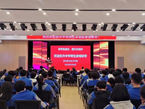 3月8日,懷寧東升中學的120余名師生到安慶職業(yè)技術學院開展參觀研學活動。同學們通過聆聽講座、參觀體驗安慶職院的教學和實訓場地,詳細了解該校各專業(yè)的建設情況介紹,幫助他們樹立初步的職業(yè)生涯規(guī)劃。