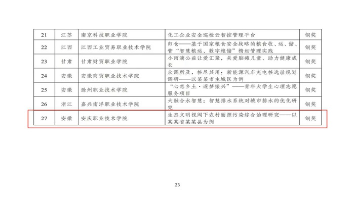 該作品著眼于“農(nóng)村面源污染”問題,致力于加強(qiáng)農(nóng)村生態(tài)文明建設(shè),有力推進(jìn)美麗鄉(xiāng)村建設(shè),增強(qiáng)農(nóng)民群眾的幸福感和獲得感,極具社會價值和實(shí)踐意義。為備戰(zhàn)本次賽事,學(xué)院領(lǐng)導(dǎo)和指導(dǎo)老師精心組織,積極籌備,努力提高競技水平。校領(lǐng)導(dǎo)高度重視此次國賽,校黨委委員、統(tǒng)戰(zhàn)部部長李五一、團(tuán)委及學(xué)生處負(fù)責(zé)同志親臨鄭州,慰問和鼓勵參賽學(xué)生。同學(xué)們也不負(fù)眾望,最終在眾多強(qiáng)隊(duì)中脫穎而出,榮獲銅獎,充分展示了安慶職院學(xué)子的青春風(fēng)采。