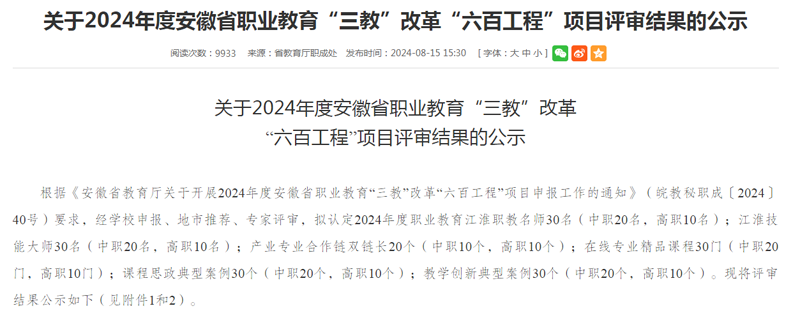 近日,安徽省教育廳公示了2024年度安徽省職業(yè)教育“三教”改革“六百工程”項目,集團5所學(xué)校共7個項目入選。