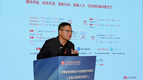 會上,華為技術(shù)有限公司培訓(xùn)與認(rèn)證部解決方案總監(jiān)李洪臣介紹了華為自主創(chuàng)新產(chǎn)業(yè)生態(tài),并發(fā)布安徽省2024產(chǎn)學(xué)合作創(chuàng)新課題。該課題是在安徽省教育廳指導(dǎo)下,由華為公司聯(lián)合安徽省職業(yè)教育與產(chǎn)業(yè)發(fā)展研究中心、安徽省職業(yè)院校現(xiàn)代產(chǎn)業(yè)學(xué)院管理辦公室,參照教育部產(chǎn)學(xué)合作協(xié)同育人項目設(shè)置內(nèi)容與運作機(jī)制在安徽省搭建的人才培養(yǎng)與教研教改平臺。課題將圍繞華為自主創(chuàng)新產(chǎn)業(yè)發(fā)展與人才培養(yǎng),設(shè)置政策研究、教學(xué)改革、師資培訓(xùn)等課題,吸引高校教師參與自主創(chuàng)新生態(tài)建設(shè),將行業(yè)技術(shù)融入人才培養(yǎng)體系中,進(jìn)而提高辦學(xué)質(zhì)量和產(chǎn)教融合水平。該課題將由安徽省教育廳納入省級質(zhì)量工程建設(shè)管理。對順利結(jié)項課題,華為技術(shù)有限公司將給予每項3-5萬元經(jīng)費資助。