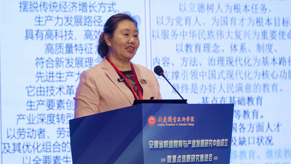 唐厚明代表安慶市政府對研究中心的成立表示熱烈的祝賀。他指出,安慶正在深入學(xué)習(xí)宣傳貫徹習(xí)近平總書記考察安徽重要講話精神,安慶發(fā)展比以往任何時候都更需要職教人才。職業(yè)教育是培養(yǎng)高素質(zhì)技術(shù)技能人才最高效、最基礎(chǔ)的途徑,是推動高質(zhì)量發(fā)展的重要支撐。近年來,安慶緊緊圍繞產(chǎn)業(yè)發(fā)展和社會需求,積極開展職業(yè)教育綜合改革和產(chǎn)教融合研究,推動教育鏈、人才鏈與產(chǎn)業(yè)鏈、創(chuàng)新鏈有機(jī)銜接。安慶職業(yè)技術(shù)學(xué)院作為安慶市屬唯一綜合性高職院校、安徽省首批地方技能型高水平大學(xué),在推動產(chǎn)教融合、校企合作、中高職一體化發(fā)展上發(fā)揮了重要的龍頭作用,在服務(wù)安慶新能源汽車產(chǎn)業(yè)集聚發(fā)展、文旅融合發(fā)展、鄉(xiāng)村振興人才培養(yǎng)、畢業(yè)生本地高質(zhì)量就業(yè)等方面作出了不可替代的重要貢獻(xiàn)。安慶職業(yè)教育改革發(fā)展取得的成績,離不開省委教育工委、省教育廳和與會專家長期以來的關(guān)心和指導(dǎo)。為高質(zhì)量推進(jìn)省級研究平臺建設(shè),他懇請省教育廳在研究中心后續(xù)建設(shè)發(fā)展中能夠持續(xù)給予關(guān)心和支持,歡迎石偉平教授等省內(nèi)外專家能夠持續(xù)不斷給予指導(dǎo)、幫助研究中心快速成長、優(yōu)質(zhì)發(fā)展,期待研究中心通過集聚研究力量在職業(yè)教育研究領(lǐng)域打造安徽品牌。